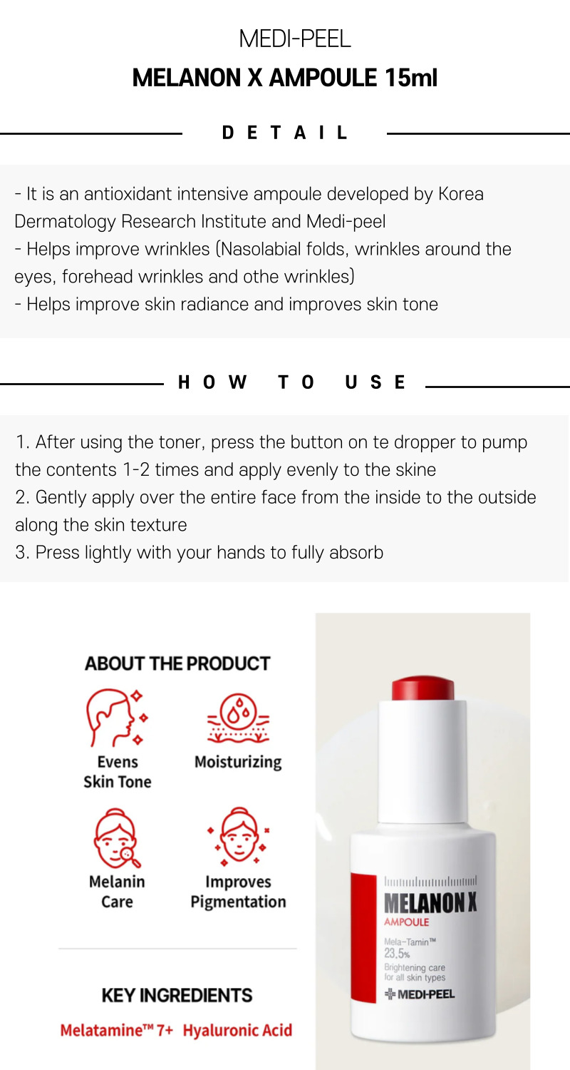 The Medi-Peel Melanon X Ampoule 50ml is a powerful brightening solution engineered to address dark spots, uneven skin tone, and overall dullness. Packed with potent actives, this concentrated ampoule penetrates deeply to help reduce the visibility of discoloration, refine skin texture, and promote a more radiant, even complexion. Its lightweight, fast-absorbing formula makes it easy to integrate into your daily skincare routine without leaving behind any sticky residue.
