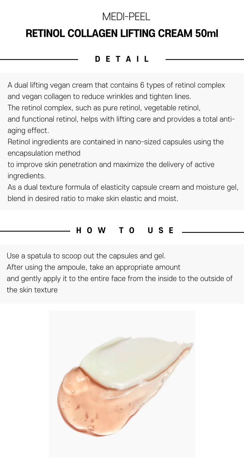 Medi-Peel Retinol Collagen Lifting Cream 50ml is an anti-aging moisturizer that targets wrinkles, uneven texture, and compromised firmness with retinol and collagen. Ideal for those seeking a lightweight yet potent cream to fortify the skin’s resilience, enhance hydration, and reveal a more youthful radiance.