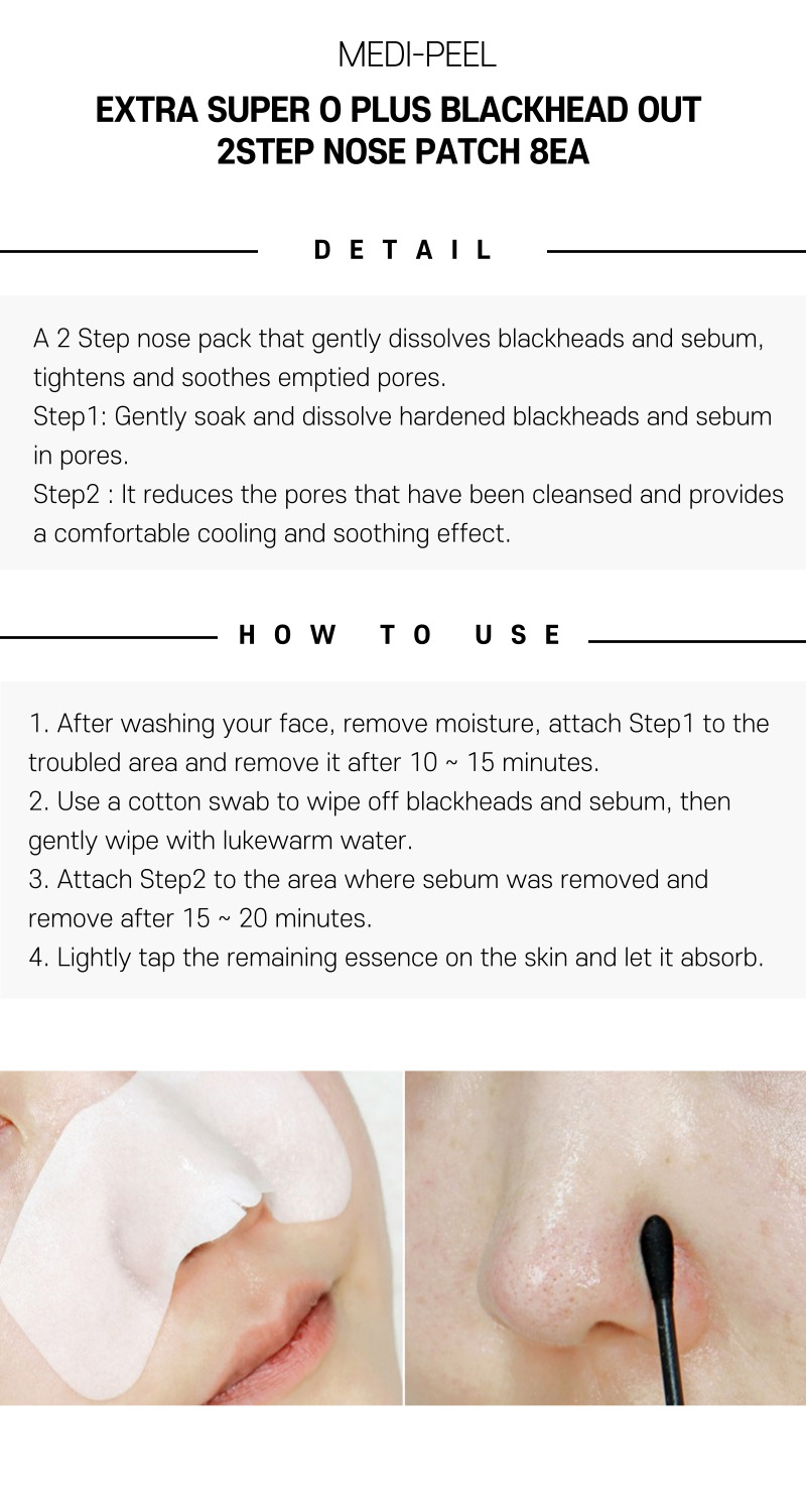 Medi-Peel Extra Super O Plus Blackhead Out 2Step Nose Patch 8ea provides a targeted solution for blackhead congestion with minimal discomfort. By combining a prepping step and a pore-extracting strip, each session helps reveal a cleaner, more refined nose area, making it a valuable addition to your weekly pore care routine.