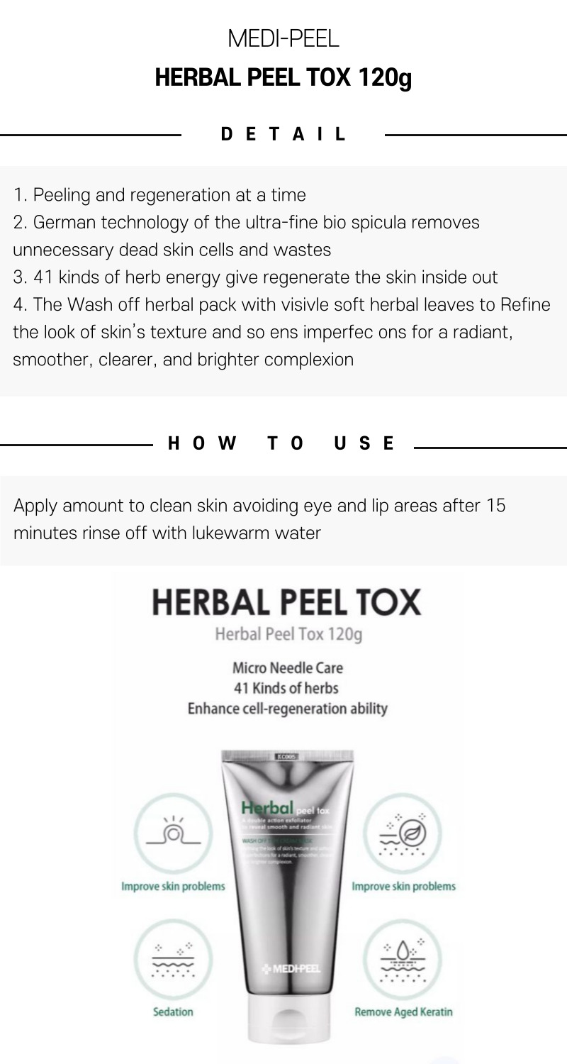Medi-Peel Herbal Peel Tox 120g is a multi-benefit exfoliating treatment focusing on natural herbal complexes to gently but effectively resurface the skin. By loosening and removing dead skin cells, it clears clogged pores, refines texture, and improves overall clarity. Ideal for weekly maintenance, it adds a bright, revived aspect to the complexion, helping you maintain a confident, healthy glow throughout the year.