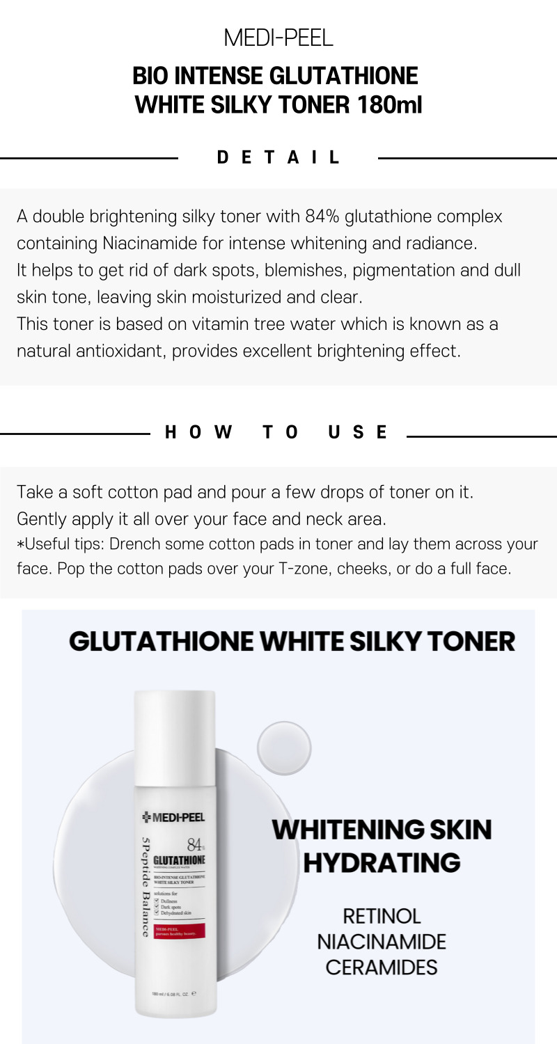 Medi-Peel Bio Intense Glutathione White Silky Toner 180ml utilizes glutathione’s brightening abilities alongside moisture-restoring elements to promote a vibrant, healthy complexion. By refining skin tone and replenishing essential hydration, it sets a strong foundation for the rest of your routine. Suitable for various skin types, this toner’s lightweight, silky texture ensures a comfortable finish that helps maintain elasticity and clarity over time.