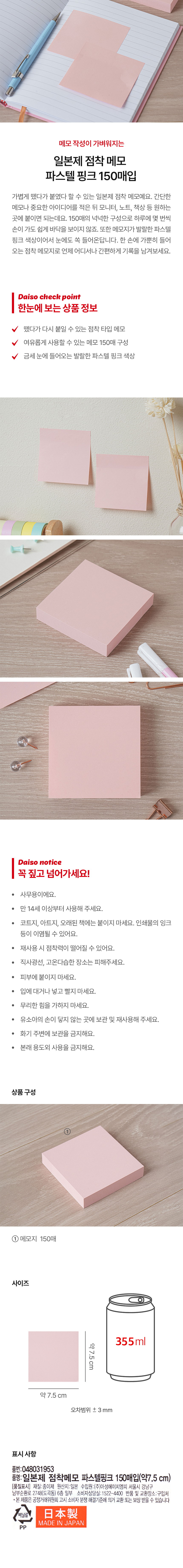 DAISO Sticky Note Pastel Pink 150 Sheets (7.5cm)