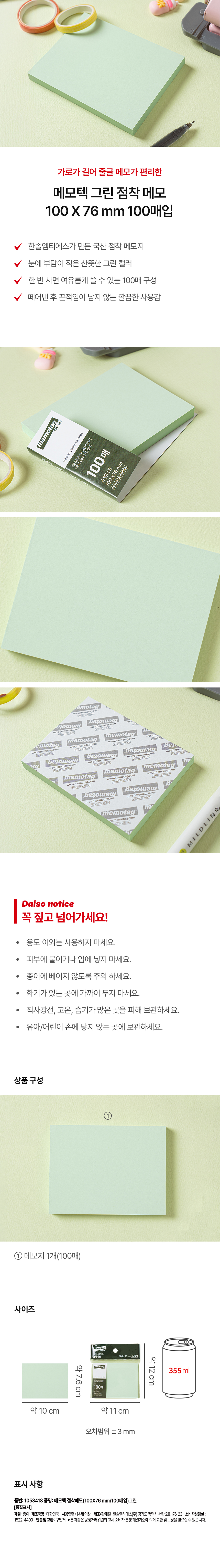 DAISO Memotech sticky note (100*76mm/100 sheets)Green