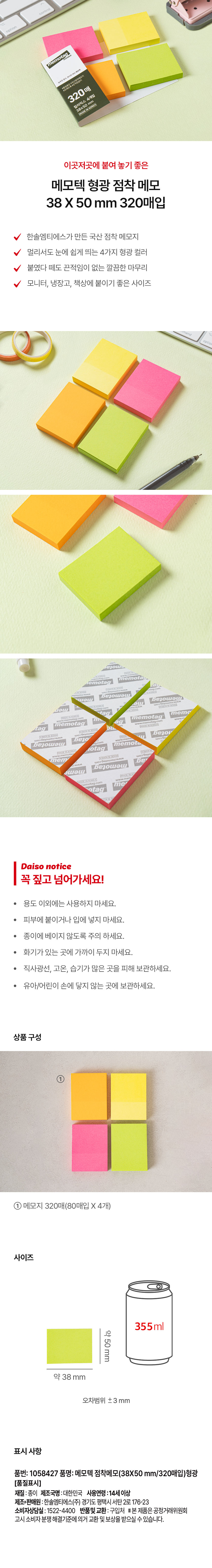 DAISO Memotech sticky note (38*50mm/320 sheets) Fluorescent
