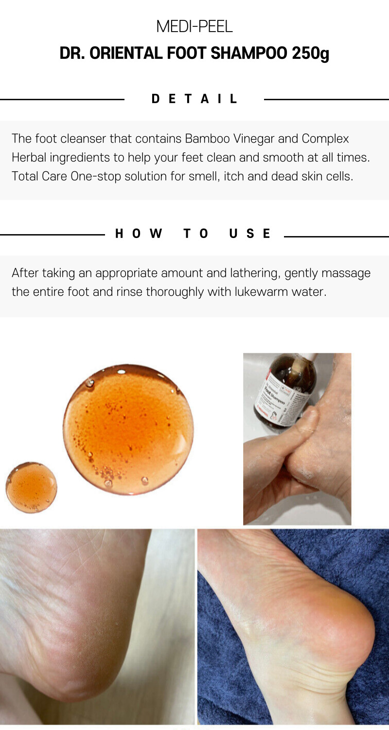 Medi-Peel Dr. Oriental Foot Shampoo 250g marries traditional herbal wisdom with contemporary cleansing science, offering a foot care solution that helps eliminate odor while nourishing skin. Perfect for everyday use or post-workout refreshes, this shampoo fosters a healthier foot environment by gently washing away impurities, soothing tired soles, and imparting a fresh, calm feel that you'll appreciate with every step.