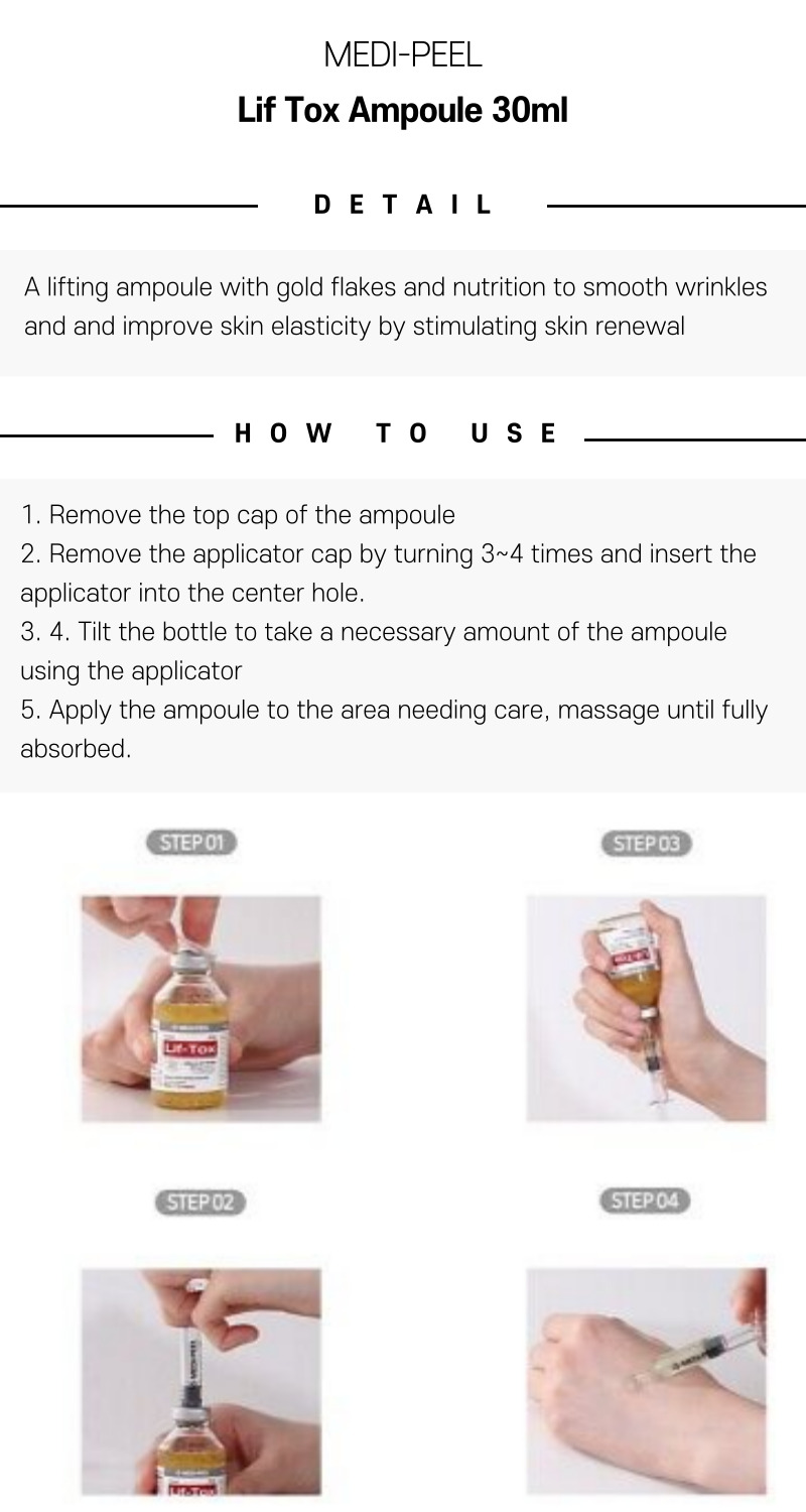 Medi-Peel Lif Tox Ampoule 30ml offers an effective lifting and smoothing solution for individuals addressing mild to moderate skin laxity. With a peptide-centered approach and lightweight feel, it optimizes daily skincare by boosting elasticity and refining texture, delivering a refreshed, visibly younger-looking complexion.