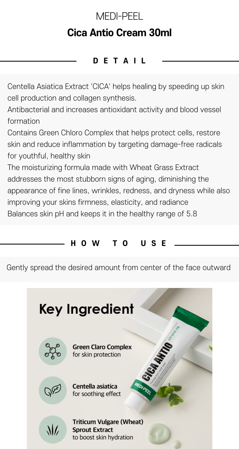 Medi-Peel Cica Antio Cream 30ml harnesses centella asiatica’s renowned calming properties in a refreshing, easily absorbed moisturizer. By helping alleviate sensitivity, dryness, and redness, it assists in maintaining a softer, more resilient complexion. Ideal for normal to dry or mildly irritated skin, this cream supports everyday comfort while optimizing the overall look and feel of your skin.