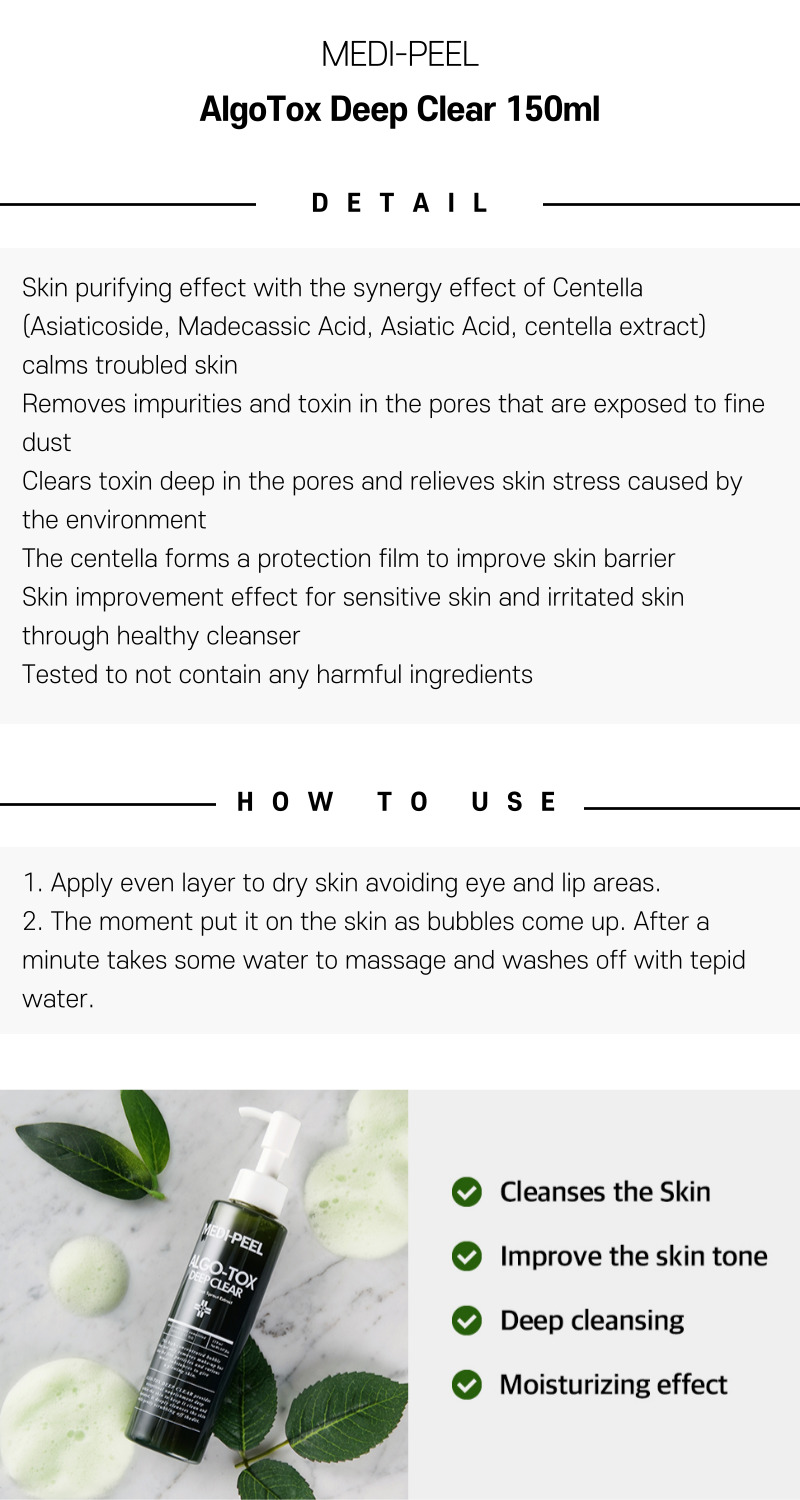 Medi-Peel Algotox Deep Clear 150ml merges marine-based extracts and reliable cleansing agents to thoroughly purify and invigorate your complexion. Tailored for daily use, this formulation addresses pore congestion and environmental buildup, ensuring skin remains soft, revitalized, and glowing throughout the day.