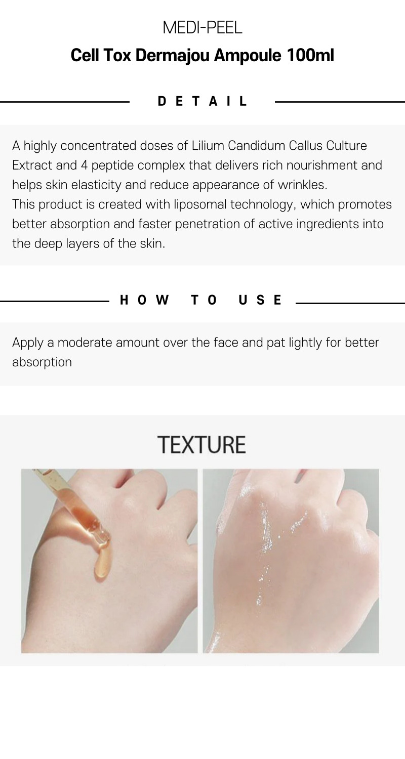 Medi-Peel Cell Tox Dermajou Ampoule 100ml delivers an intensive moisture surge and advanced actives to support overall skin resilience. By integrating into your daily rituals, it assists in revitalizing the barrier, alleviating dryness, and presenting a supple, more radiant appearance—excellent for anyone seeking a silky, healthier-looking complexion.