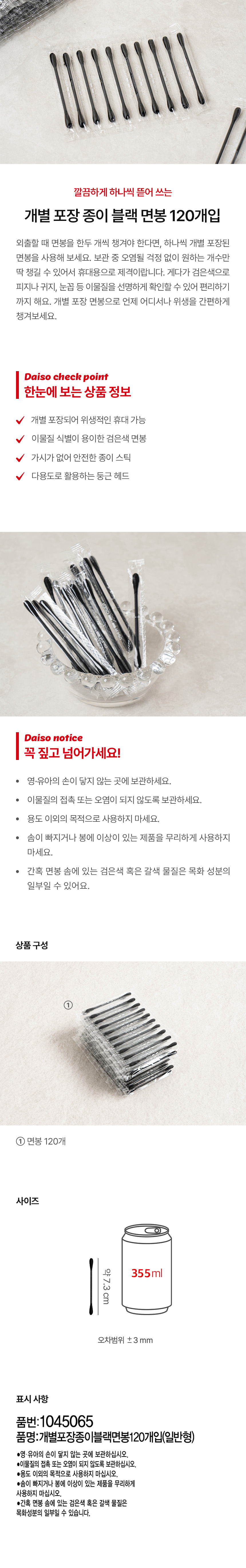 DAISO Individually wrapped Paper Black Cotton Swabs 120 pcs (Standard)