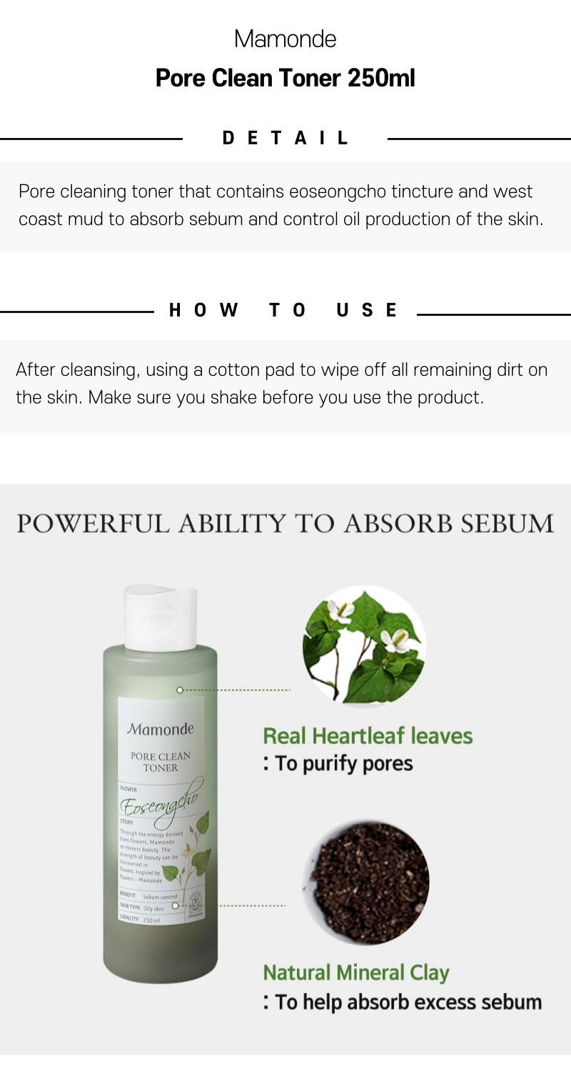 Mamonde Pore Clean Toner 250ml is a clarifying solution designed to target excess oil and impurities. Enriched with Eoseongcho (houttuynia cordata) extract and mineral-infused clay, this toner works to absorb sebum and unclog pores, helping to refine skin texture and reduce the look of enlarged pores. Its light, refreshing formula provides a comfortable finish, making it suitable for daily use on oily, combination, or congested skin types.