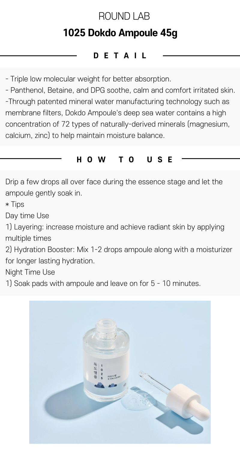 The ROUND LAB 1025 Dokdo Ampoule 45g is a concentrated skincare solution featuring deep seawater sourced from Ulleungdo. Packed with essential minerals, this ampoule delivers potent hydration and nourishment to help revitalize dull, dehydrated skin. Its lightweight texture absorbs effortlessly, leaving your complexion feeling comfortable and looking radiant without any sticky residue.