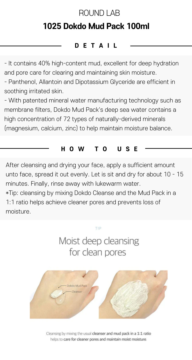 The ROUND LAB 1025 Dokdo Mud Pack 100ml provides a deep-cleansing, revitalizing experience for oily or combination skin types. Its gentle, mineral-enriched formula helps purify and balance the complexion, making it a must-have for those seeking a fuss-free, effective at-home spa treatment.