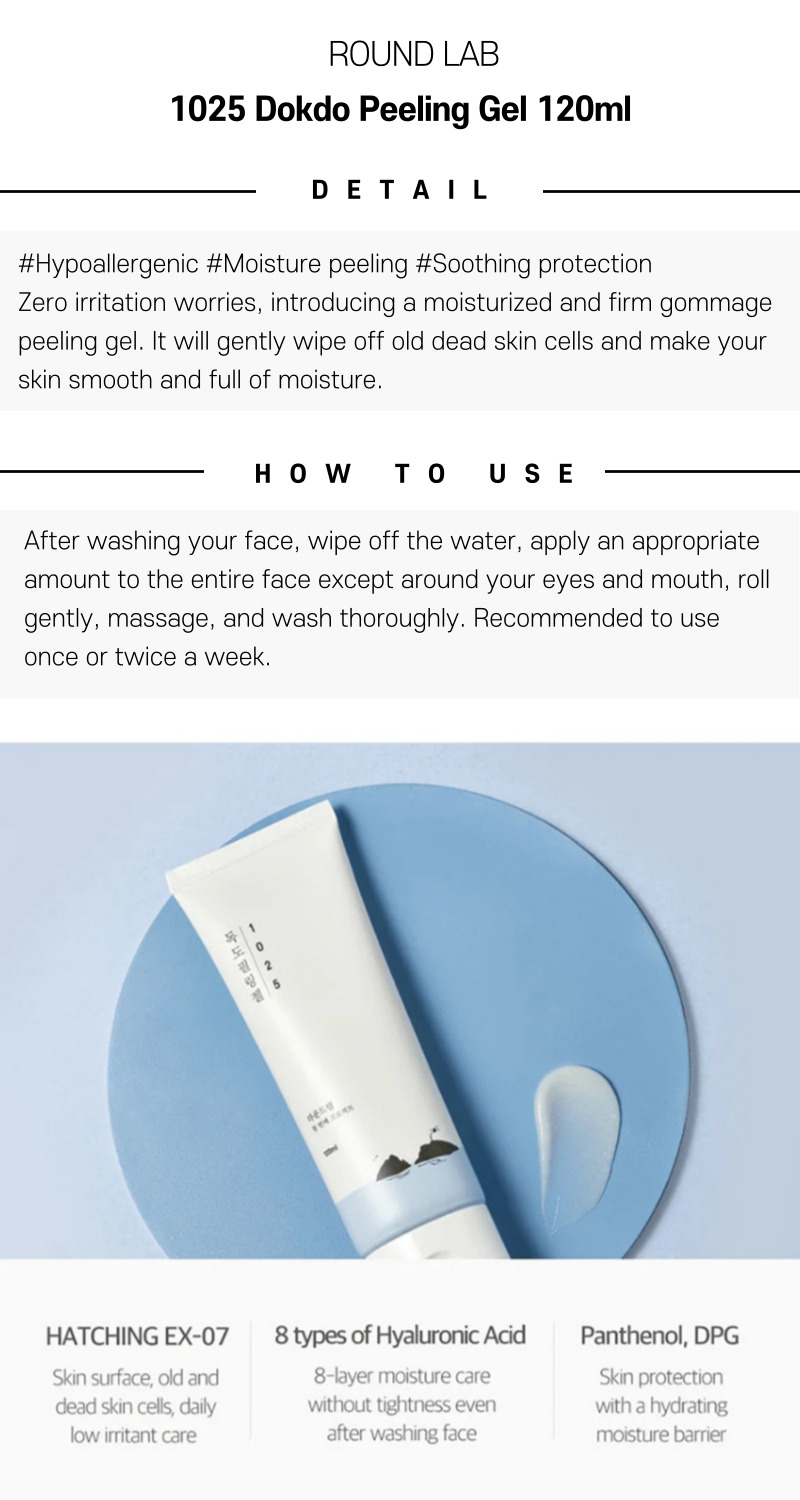 ROUND LAB 1025 Dokdo Peeling Gel 120ml provides a gentle yet thorough exfoliation that helps reveal healthier, more radiant skin. Enriched with mineral-rich deep seawater, it simultaneously nourishes and polishes the complexion, making it an ideal choice for regular upkeep of smooth, luminous skin.