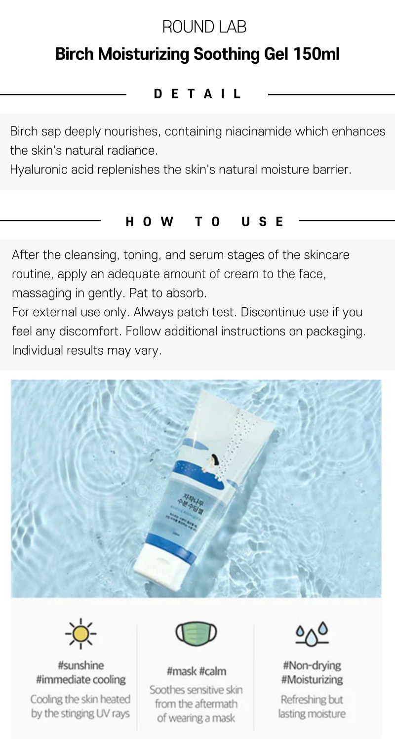 ROUND LAB Birch Moisturizing Soothing Gel 150ml delivers a gentle, cooling burst of hydration and relief, courtesy of birch extract. Whether used post-sun, post-workout, or simply to round out your skincare routine, this lightweight gel provides a versatile approach to soothing and hydrating your skin every day.