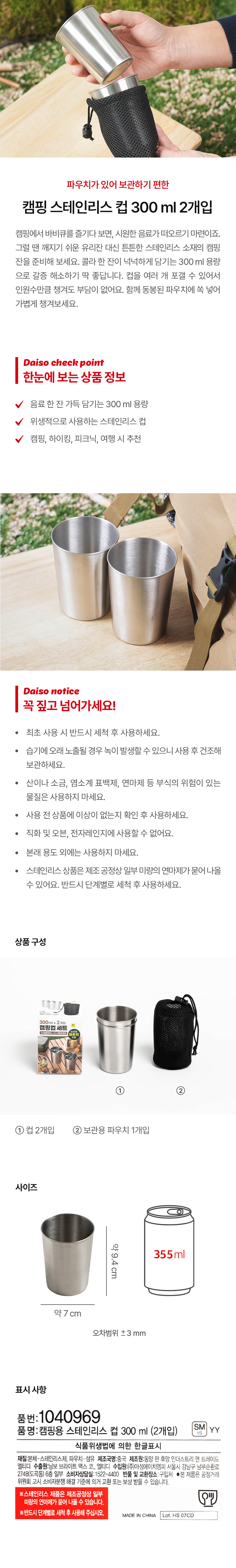 DAISO Camping Stainless Steel Cup 300ml (2 pieces)