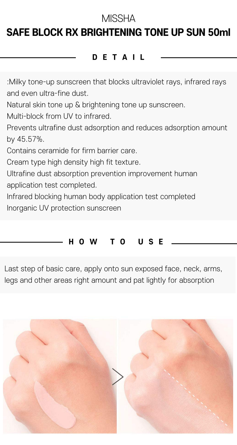 The MISSHA SAFE BLOCK RX BRIGHTENING TONE UP SUN is a cutting-edge sunscreen that not only offers robust broad-spectrum protection from harmful UVA and UVB rays but also works to enhance skin brightness and even out tone. Its dual-function formula delivers a radiant finish while safeguarding your skin, making it an ideal choice for those who desire both protection and a cosmetic boost.