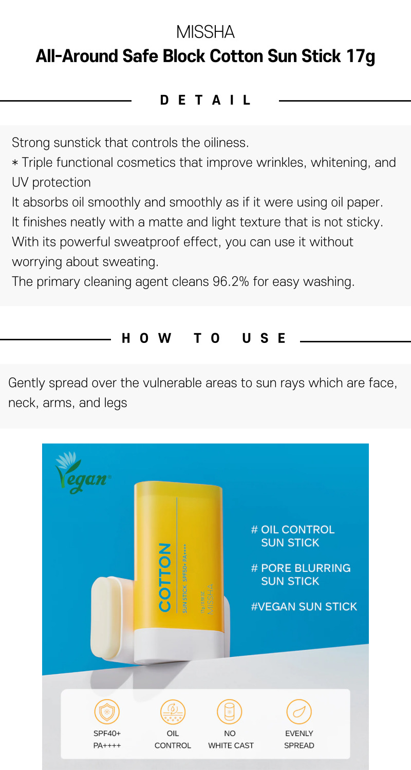 The MISSHA All-Around Safe Block Cotton Sun Stick is an innovative sunscreen stick that combines advanced broad-spectrum protection with a unique cotton-finish texture. Its lightweight, non-greasy formula absorbs quickly, leaving your skin with a soft, matte, and breathable finish reminiscent of cotton. Designed for on-the-go application, this sun stick is perfect for quick touch-ups and outdoor activities.