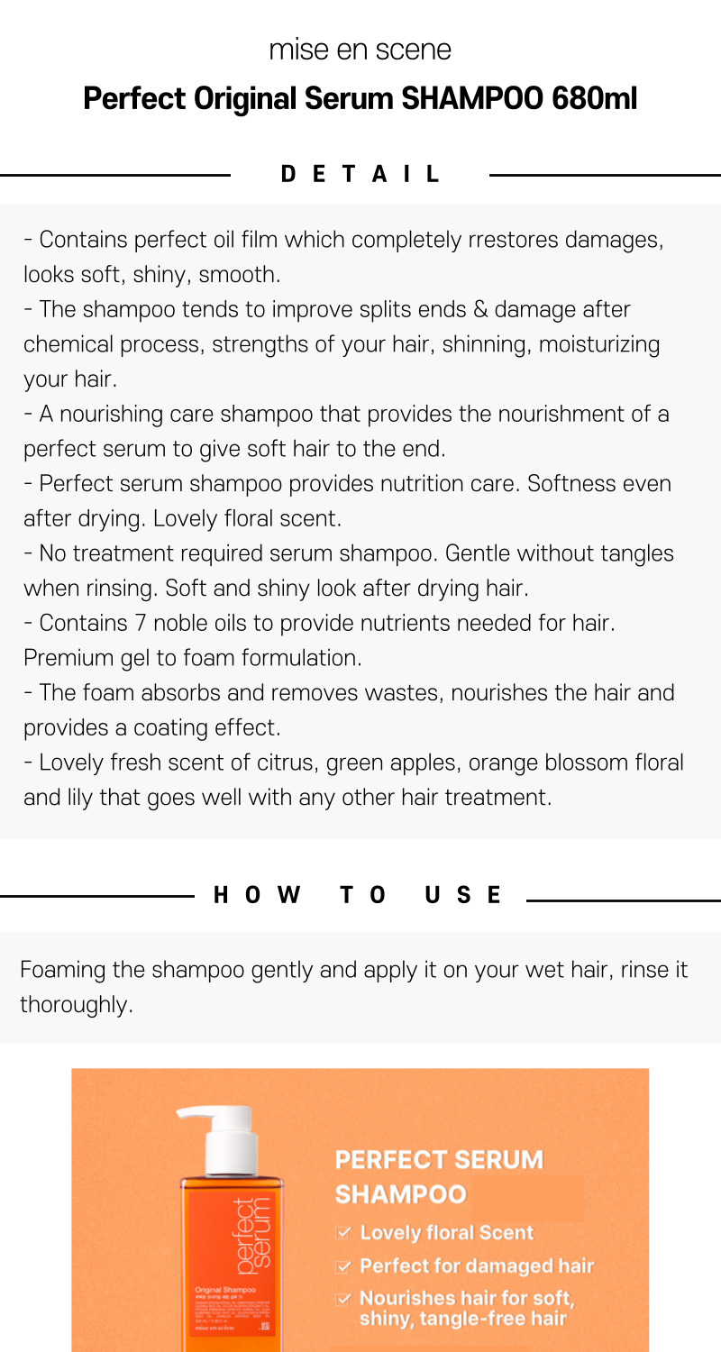 Discover the ultimate care for your hair with the Mise En Scene Perfect Original Serum Shampoo. Enriched with seven premium oils, this shampoo gently cleanses while delivering intense nourishment to dry and damaged hair. Experience smoother, shinier, and healthier-looking locks after every wash with the trusted Perfect Serum formula.