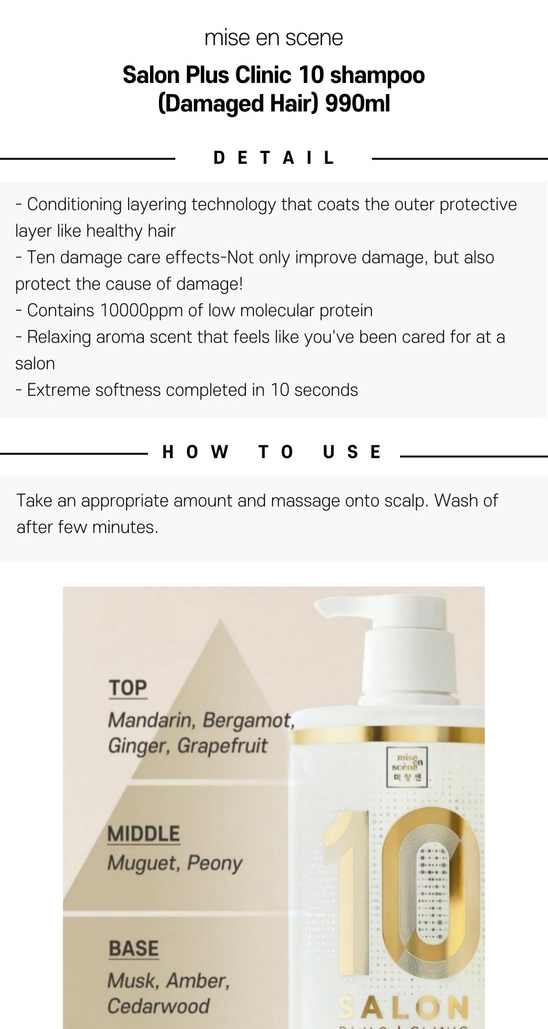 Wet your hair thoroughly and apply an appropriate amount of shampoo. Massage gently into the scalp and hair to create a rich lather, then rinse thoroughly with lukewarm water. For best results, follow with Mise En Scene Salon Plus Clinic 10 Conditioner.