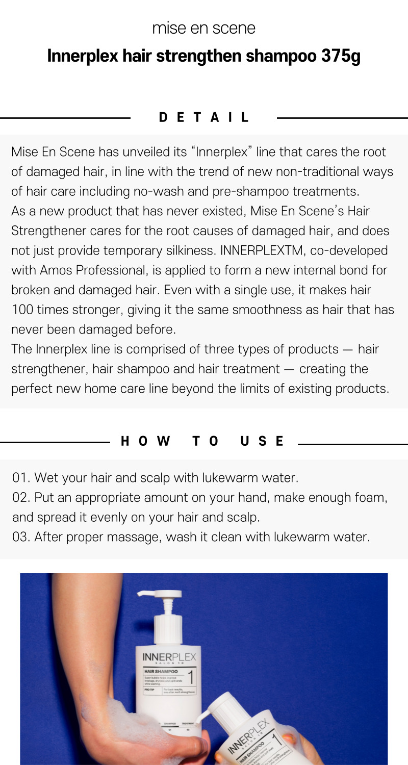 Wet your hair thoroughly and apply an appropriate amount of shampoo. Massage gently into the scalp and hair to create a rich lather, then rinse thoroughly with lukewarm water. For optimal results, follow with Mise En Scene Innerplex Hair Strengthen Conditioner.