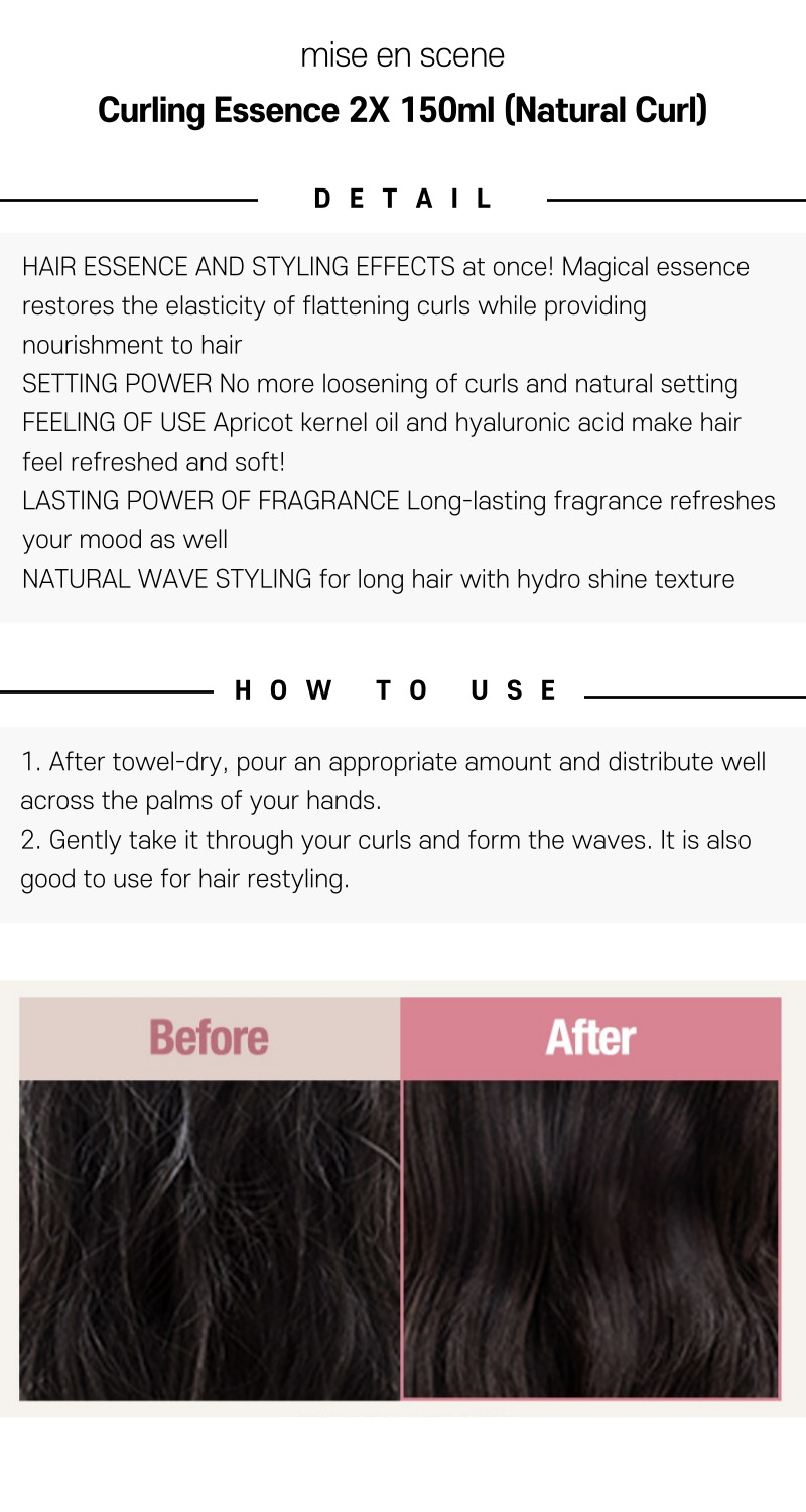 Define and enhance your curls with the Mise En Scene Curling Essence 2X (Natural Curl). This dual-action essence provides intense hydration and hold, ensuring your natural curls stay bouncy and defined all day. Enriched with Argan Oil and Curl Enhancing Complex, it tames frizz while delivering a smooth, shiny finish.