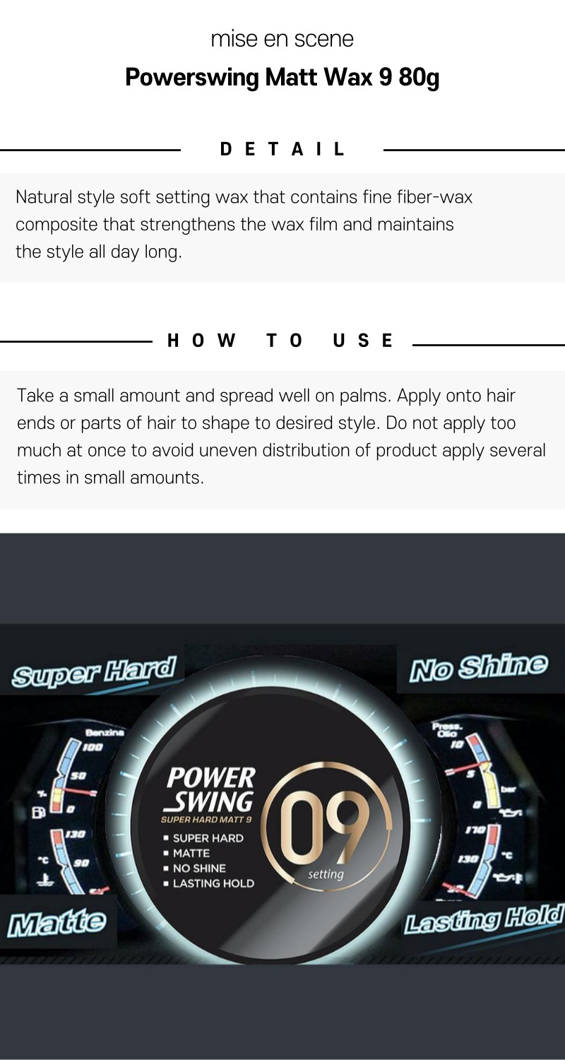 Achieve bold and defined hairstyles with the Mise En Scene Powerswing Matt Wax 9. This high-hold matte wax provides maximum styling control and a natural finish, making it perfect for sharp and textured looks. Its lightweight formula allows for easy application and restyling throughout the day.