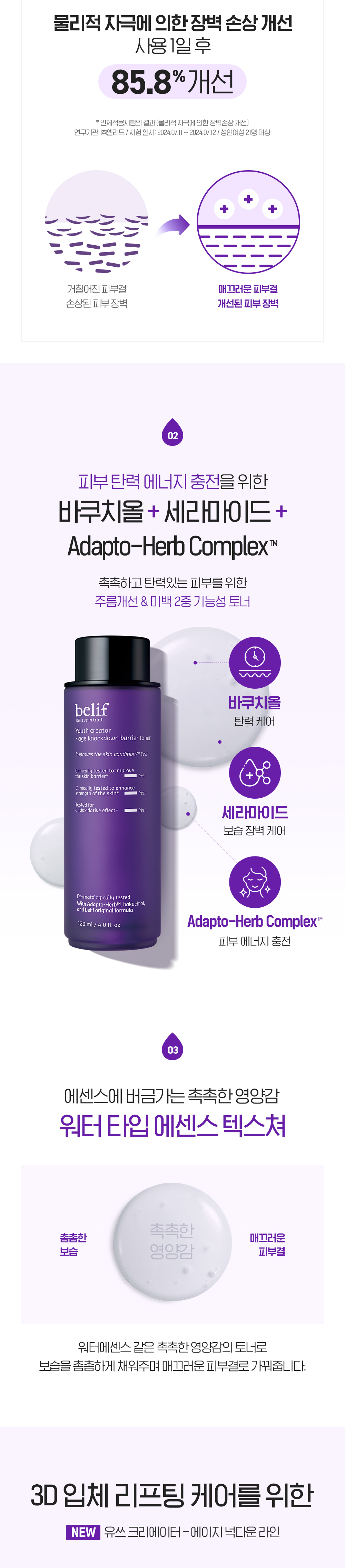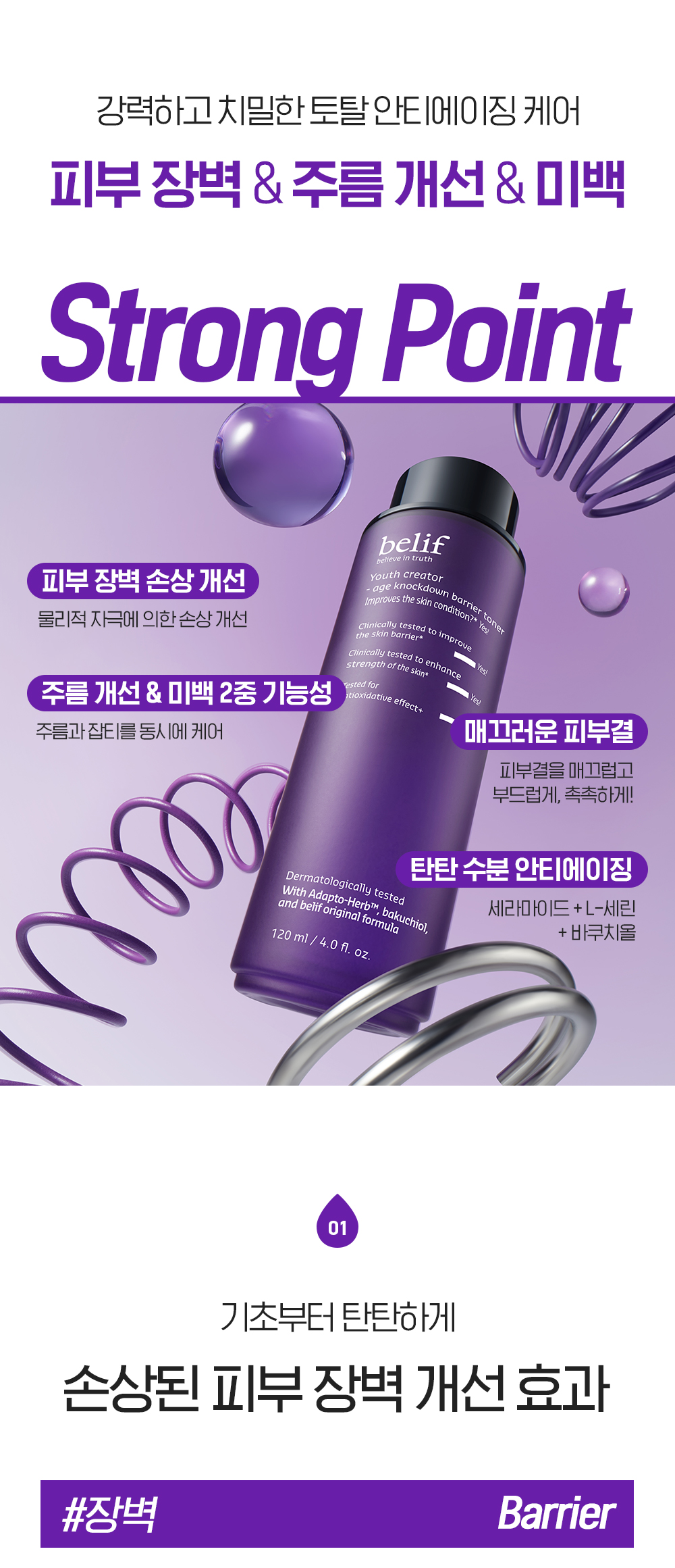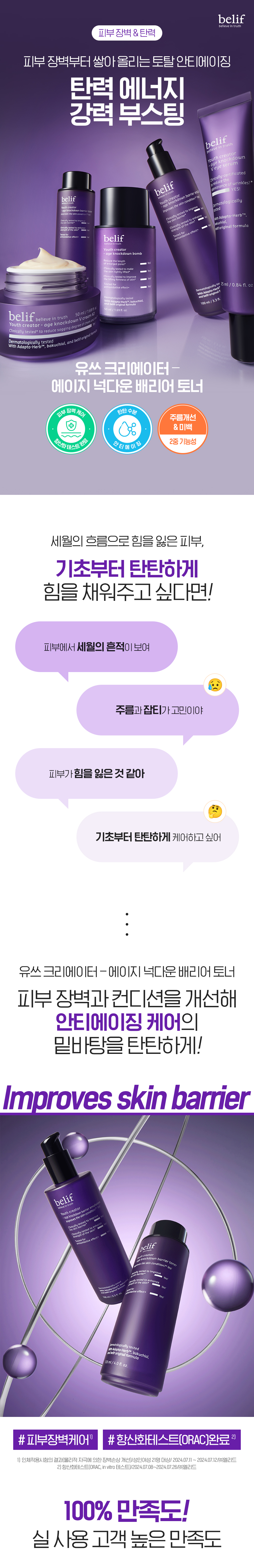 Rejuvenate your skin with the Belif Youth Creator Age Knockdown Barrier Toner. Formulated to strengthen the skin barrier, this lightweight yet powerful toner enhances hydration, smooths fine lines, and improves elasticity. Perfect for daily use, it preps your skin for the next steps in your skincare routine while leaving it feeling soft, firm, and youthful.