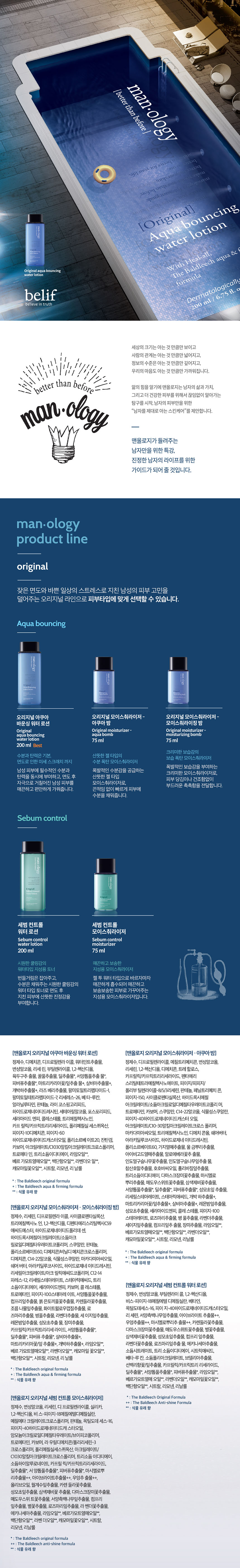 Experience the refreshing hydration of the Belif Manology Original Aqua Bouncing Water Lotion, a moisturizing lotion specifically formulated for men's skin. This lotion replenishes moisture and enhances skin elasticity, leaving it smooth and resilient in a single application. It effectively soothes irritated, tired skin caused by frequent shaving, providing comfort and hydration without any stickiness.