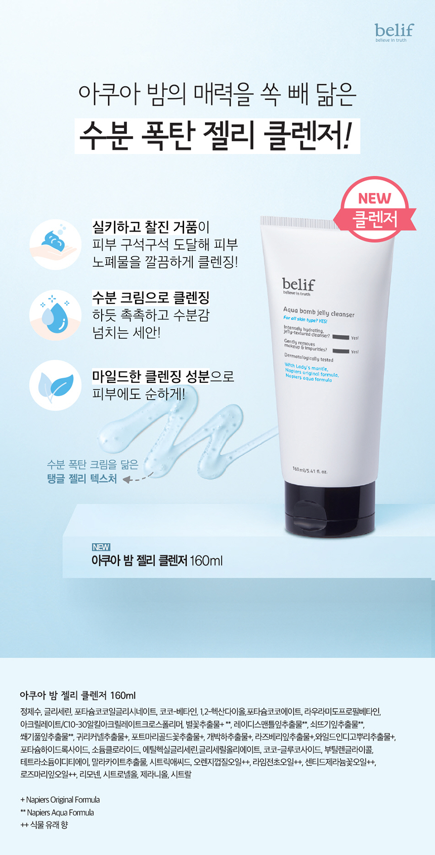 Experience a refreshing cleanse with the Belif Aqua Bomb Jelly Cleanser, a gentle, sulfate-free cleanser that transforms from a jelly to a silky, bouncy lather. This cleanser effectively removes makeup and impurities without stripping the skin of moisture, leaving it hydrated and refreshed. :contentReference[oaicite:1]{index=1}