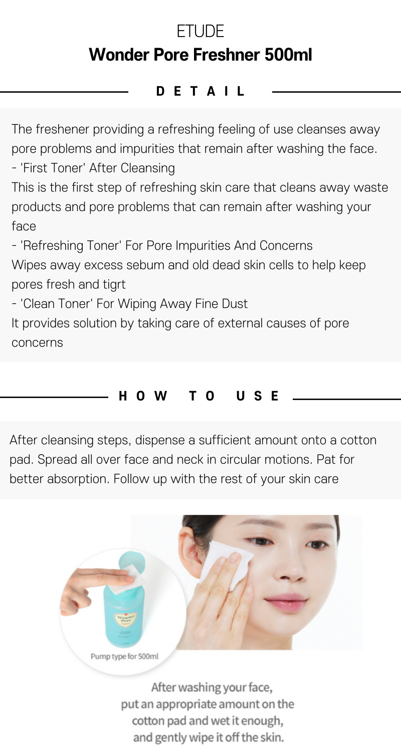 Keep your pores clean and healthy with the ETUDE Wonder Pore Freshner. Infused with peppermint extract, this toner deeply cleanses inside and outside of pores while balancing your skin's pH level. It helps maintain clear skin, removes excess sebum, and prevents skin troubles.