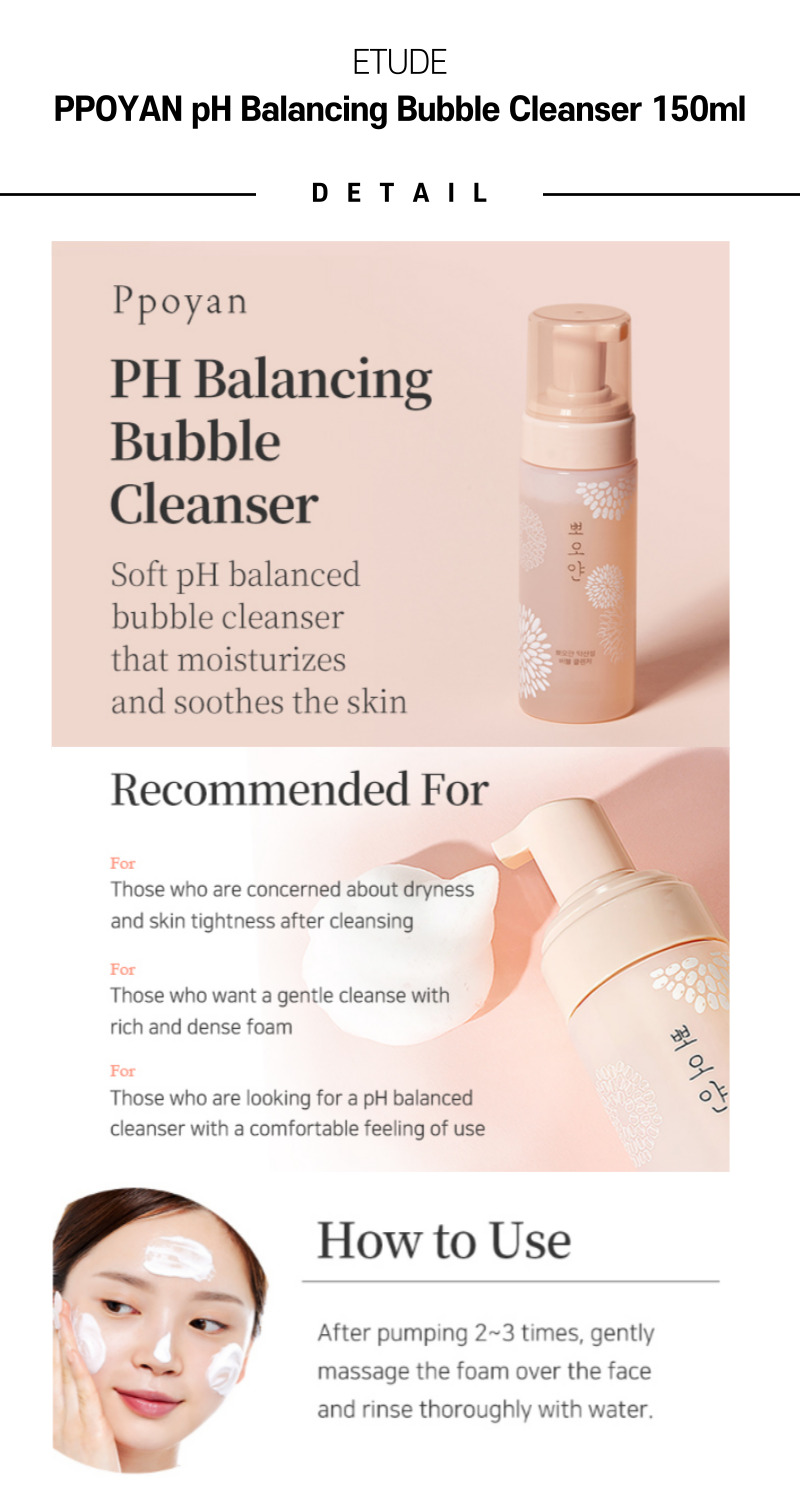 Experience gentle and effective cleansing with the ETUDE PPOYAN pH Balancing Bubble Cleanser. This cleanser is formulated to maintain the skin's natural pH balance, ensuring a mild yet thorough cleanse without stripping the skin of its natural moisture. The rich, micro-bubble foam effectively removes impurities, leaving the skin feeling fresh and hydrated.