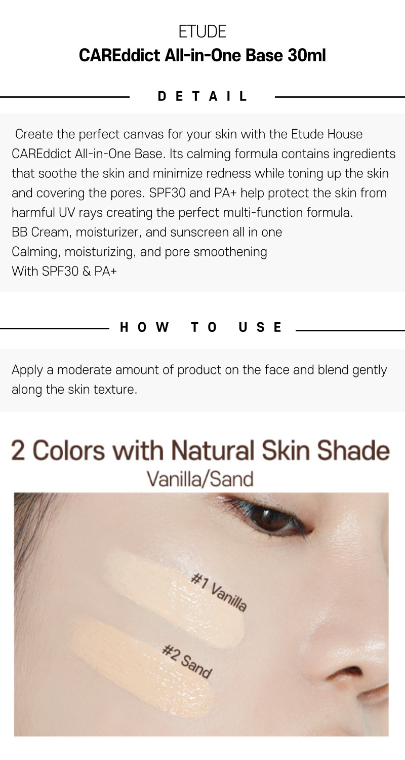 Simplify your skincare and makeup routine with the ETUDE CAREddict All-in-One Base. This multi-functional base combines the benefits of skincare and makeup into one easy step. With its lightweight, hydrating formula, it moisturizes, evens skin tone, and preps your skin for a flawless foundation application.