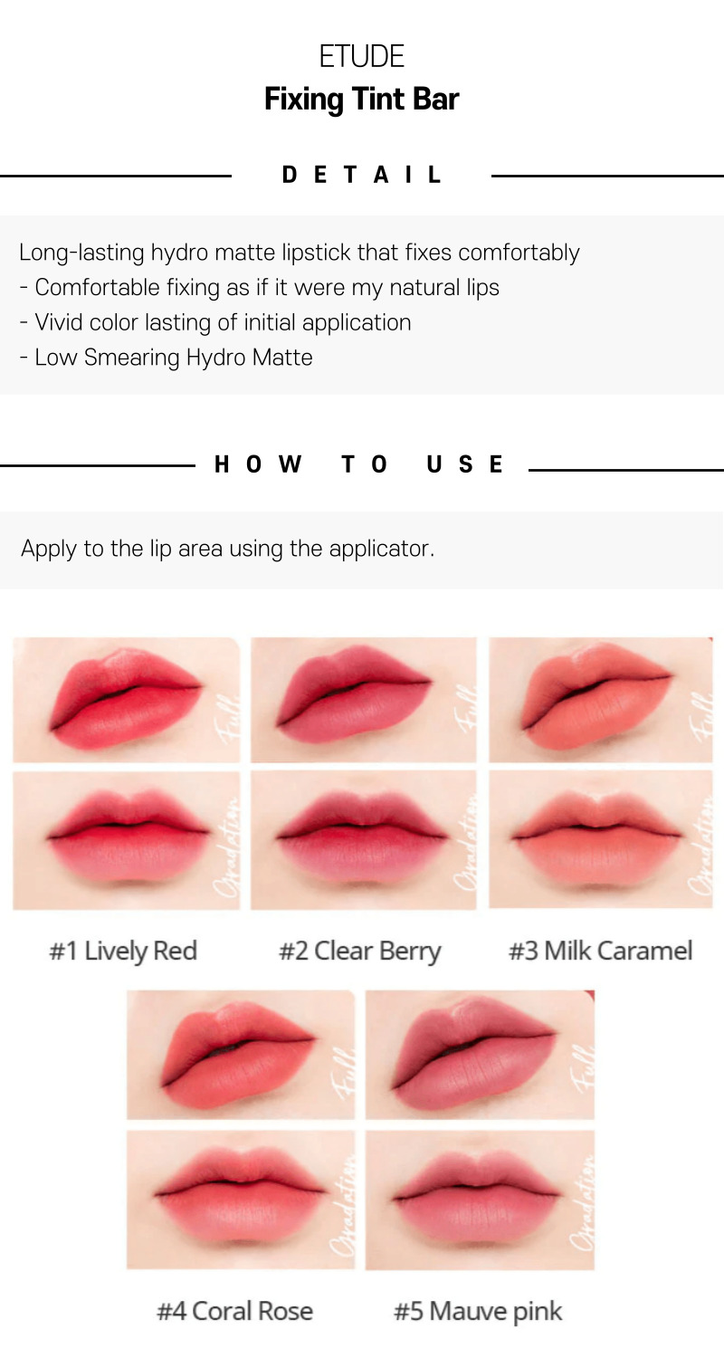 Achieve vibrant and long-lasting lip color with the ETUDE Fixing Tint Bar. This semi-matte tint bar glides smoothly onto your lips, delivering rich pigmentation with a lightweight, comfortable finish. Its transfer-proof formula ensures flawless lips all day long.