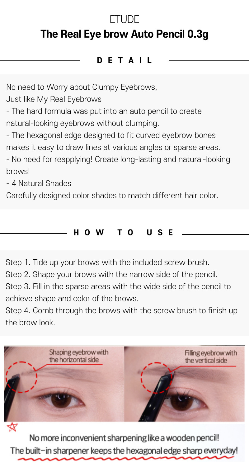 Effortlessly shape and define your brows with the ETUDE The Real Eye Brow Auto Pencil. This user-friendly auto pencil features a soft, angled tip for precise application and a spoolie brush for blending, allowing you to create natural-looking brows with ease. Its long-lasting formula ensures your brows stay flawless all day.