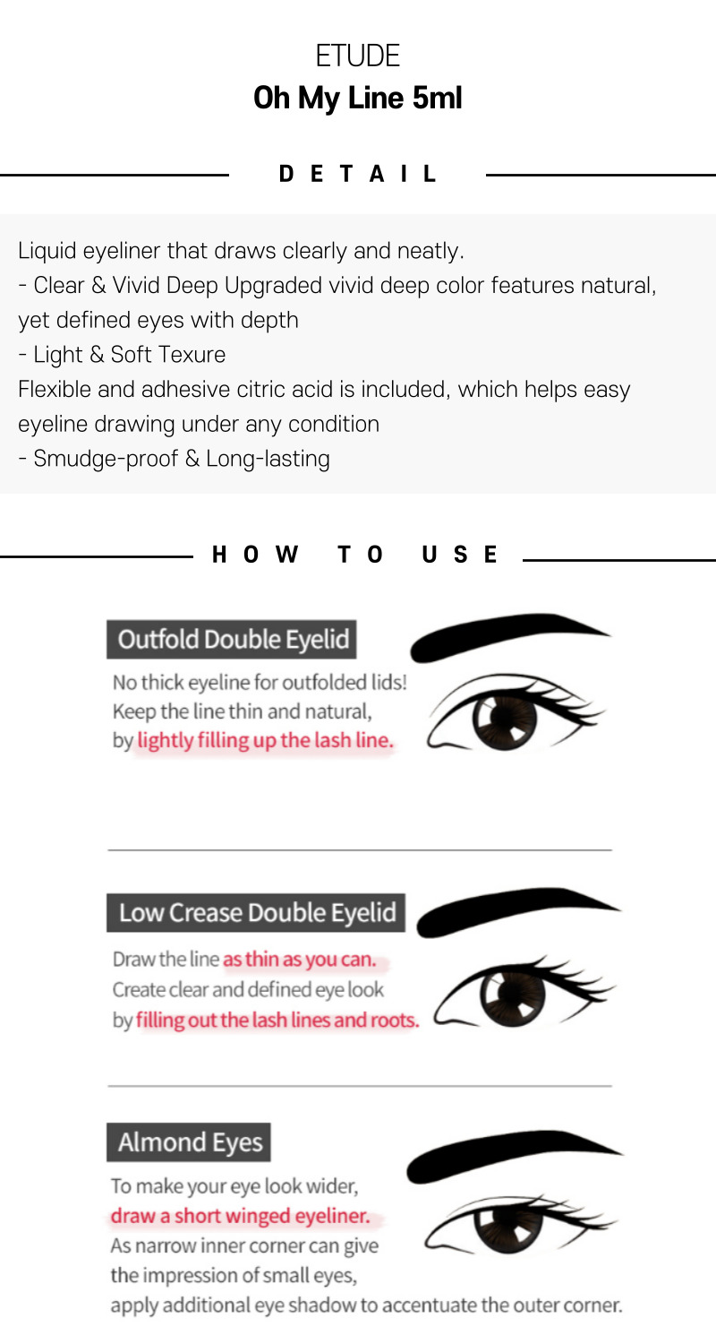 Create bold and defined eye looks effortlessly with the ETUDE Oh My Line. This liquid eyeliner features a precise brush tip that allows for smooth, even application, making it easy to create anything from subtle lines to dramatic wings. Its quick-drying, smudge-proof formula ensures long-lasting perfection.