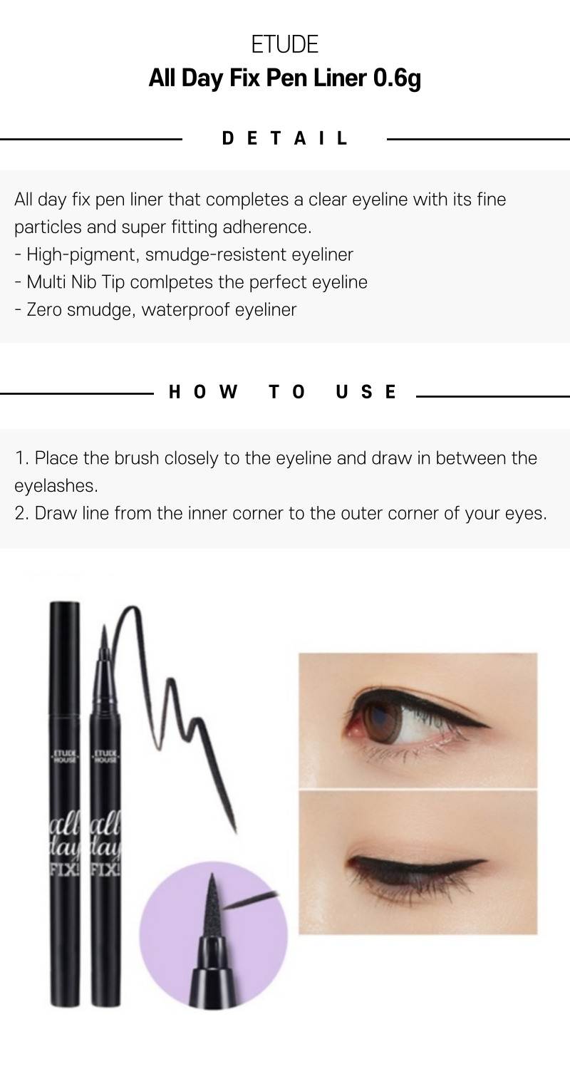Achieve precise and long-lasting eye looks with the ETUDE All Day Fix Pen Liner. This high-performance pen eyeliner features a fine brush tip for effortless application, allowing you to create everything from natural lines to bold wings. Its smudge-proof, waterproof formula ensures your eyeliner stays flawless all day.