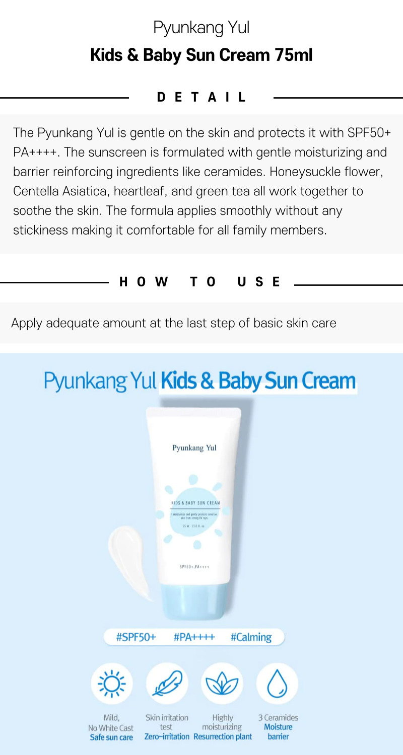 Packaged in a sleek 75ml bottle, Pyunkang Yul Kids & Baby Sun Cream 75ml offers a gentle yet effective sun protection solution specially formulated for the delicate skin of kids and babies. Its lightweight, non-greasy formula delivers balanced hydration and broad-spectrum UV defense, ensuring your child's skin stays healthy, soft, and protected during daily outdoor activities. For complete product specifications, ingredient details, and additional information, please refer to the official Pyunkang Yul website and authorized retailers.