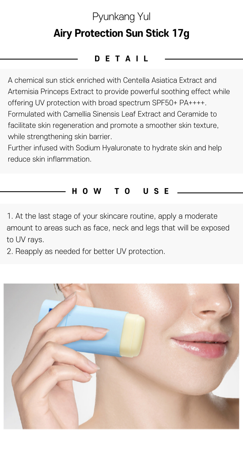 Packaged in a sleek 17g stick, the Pyunkang Yul Airy Protection Sun Stick 17g is expertly formulated to provide reliable, everyday sun protection in a compact, travel-friendly design. Its innovative, lightweight formula ensures that your skin is shielded from harmful UV rays while maintaining a natural, non-oily finish. For the most current product specifications, updated ingredient details, and additional information, please refer to the official Pyunkang Yul website or consult authorized retailers.