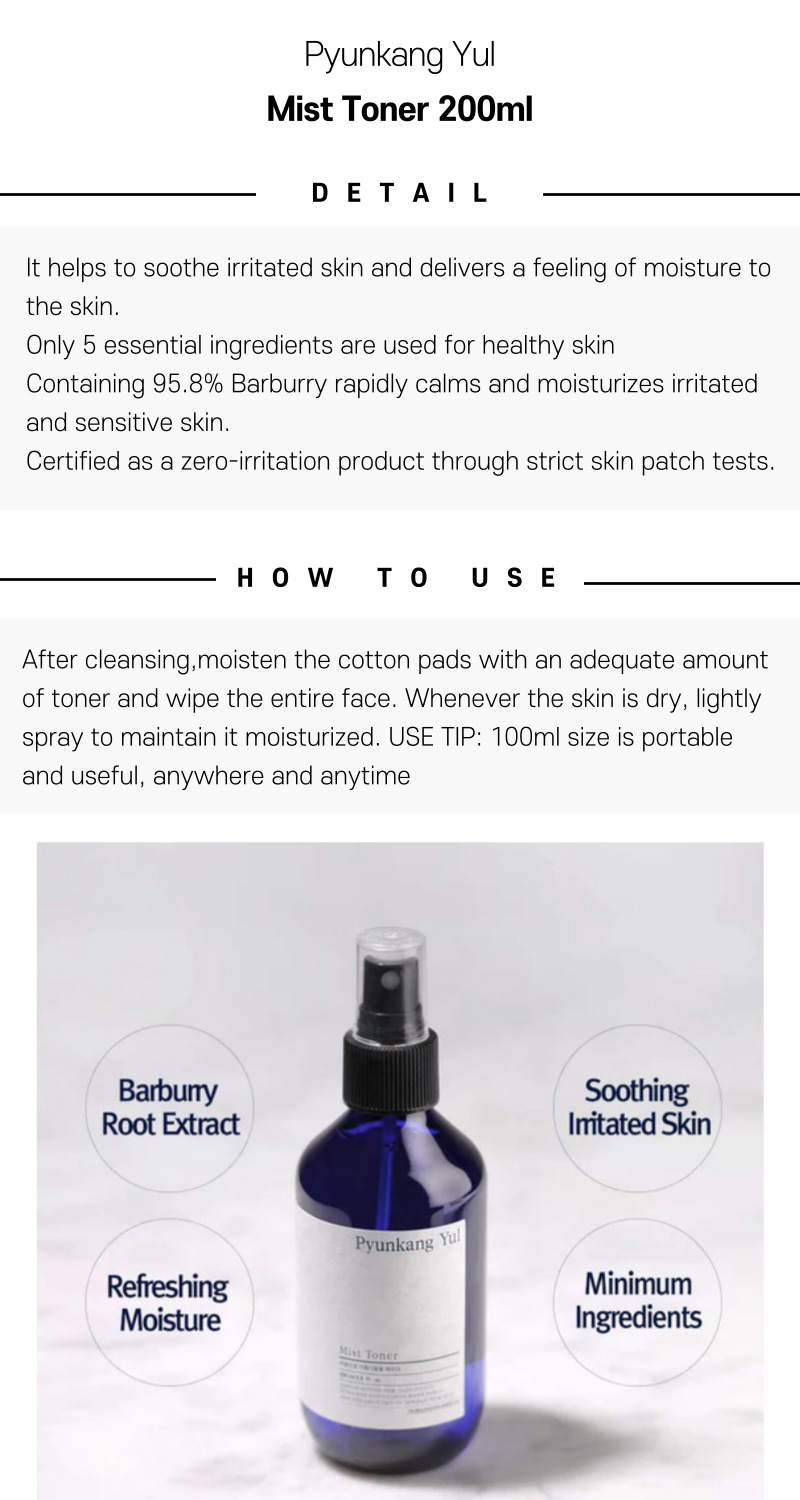 Packaged in a convenient 200ml bottle, the Pyunkang Yul Mist Toner 200ml offers a refreshing burst of hydration that instantly revitalizes your skin. Its fast-absorbing, lightweight formula is designed to soothe and balance your complexion, making it an ideal step in your daily skincare routine. For the most current product specifications, updated ingredient details, and additional information, please refer to the official Pyunkang Yul website or consult authorized retailers.