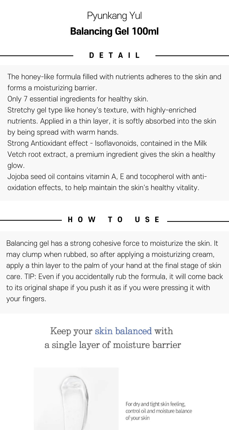 Packaged in a sleek 100ml bottle, the Pyunkang Yul Balancing Gel 100ml is meticulously formulated to provide an optimal balance of hydration and oil control. Its advanced oil-free technology makes it an essential addition to your daily skincare routine, especially for those with combination to oily skin. For the latest product specifications, detailed ingredient information, and further insights, please refer to the official Pyunkang Yul website or consult authorized retailers.