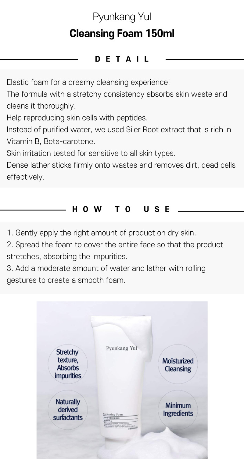 Packaged in a sleek 150ml bottle, the Pyunkang Yul Cleansing Foam 150ml is meticulously formulated to deliver a refreshing and thorough cleansing experience. Its advanced, pH-balanced formula gently purifies your skin, leaving it clear, soft, and well-prepared for subsequent skincare steps. For the latest product specifications, updated ingredient details, and further information, please refer to the official Pyunkang Yul website or consult authorized retailers.