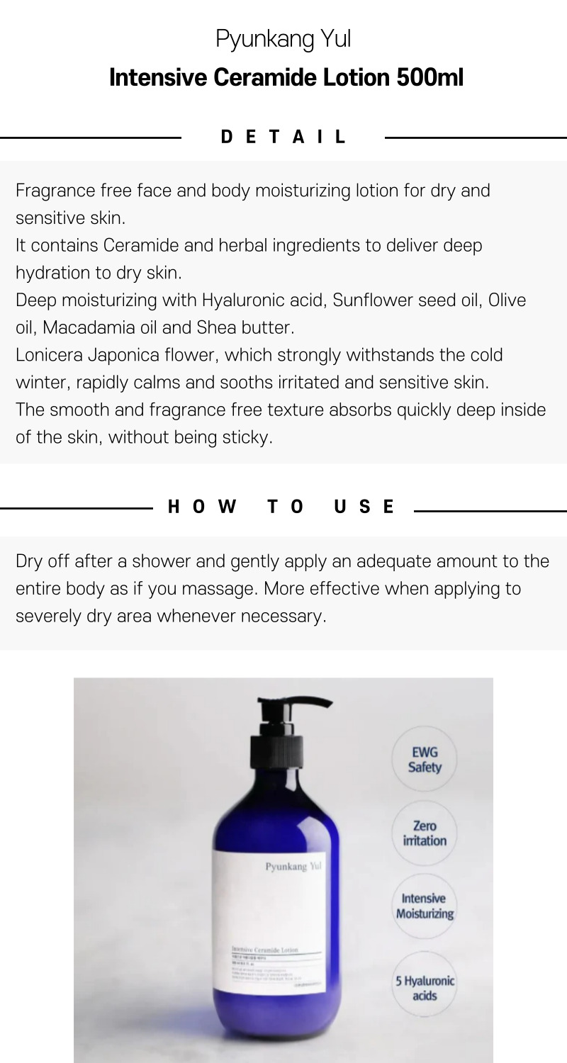 Packaged in a sleek 500ml bottle, the Pyunkang Yul Intensive Ceramide Lotion 500ml is meticulously crafted to provide a comprehensive solution for intensive skin repair and hydration. Its innovative formula, enriched with essential ceramides and moisture-locking ingredients, works to restore your skin's natural barrier and deliver lasting hydration. For the most up-to-date product specifications, detailed ingredient information, and further insights, please refer to the official Pyunkang Yul website or consult authorized retailers.
