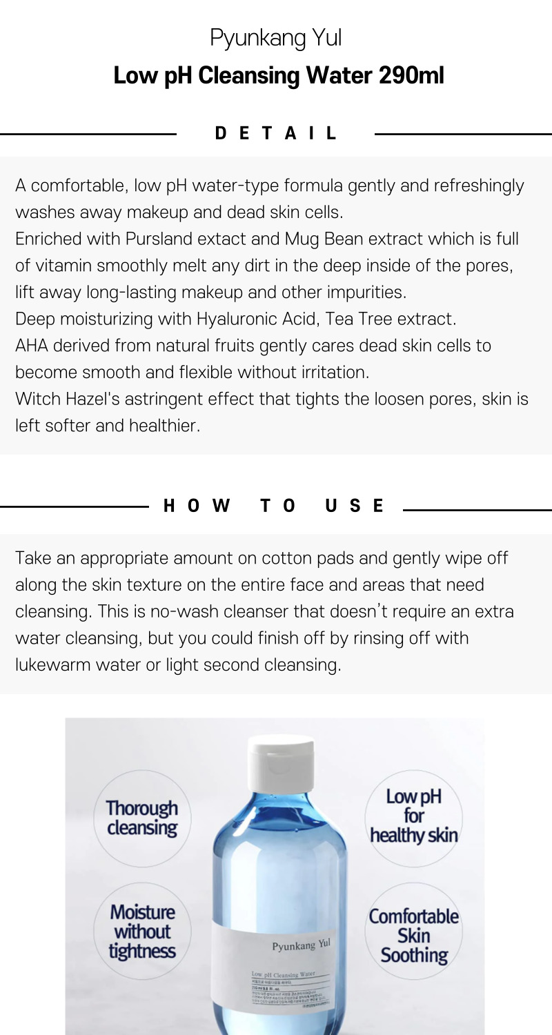 Packaged in a sleek 290ml bottle, the Pyunkang Yul Low pH Cleansing Water 290ml is meticulously formulated to provide a balanced cleansing experience that leaves your skin feeling refreshed and hydrated. Its low pH formula supports the skin's natural barrier, making it an excellent choice for daily use. For the most current product specifications, detailed ingredient information, and further insights, please refer to the official Pyunkang Yul website or consult authorized retailers.