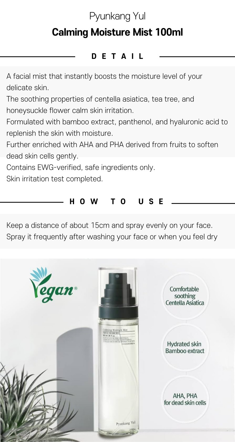 Packaged in a sleek 100ml bottle, the Pyunkang Yul Calming Moisture Mist 100ml is meticulously formulated to provide a refreshing burst of hydration while soothing and balancing your skin. Its carefully selected ingredients work synergistically to maintain your skin's natural moisture balance, making it an indispensable addition to your daily skincare routine. For the most up-to-date product specifications, detailed ingredient information, and further insights, please refer to the official Pyunkang Yul website or consult authorized retailers.
