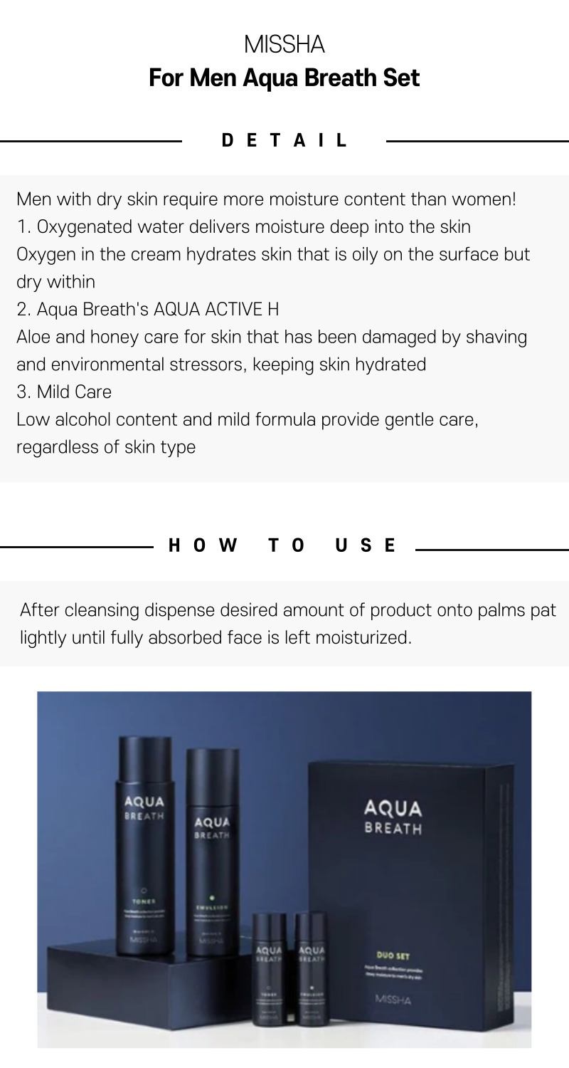 The MISSHA For Men Aqua Breath Set is a comprehensive skincare collection designed exclusively for men. This set combines all the essential steps – including a refreshing toner, a hydrating emulsion, and a versatile all-in-one product – into one convenient package. Each product is formulated with lightweight, non-greasy ingredients that provide deep hydration, balance, and a cooling sensation, making it ideal for active, busy lifestyles.