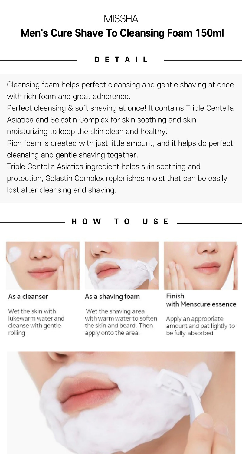 The MISSHA Men's Cure Shave To Cleansing Foam is a specialized cleansing foam formulated especially for men. Designed to provide effective post-shave care, this innovative foam gently removes residual shaving cream, impurities, and dead skin cells while soothing and refreshing the skin. Its lightweight, fast-absorbing formula leaves your face clean, calm, and rejuvenated.
