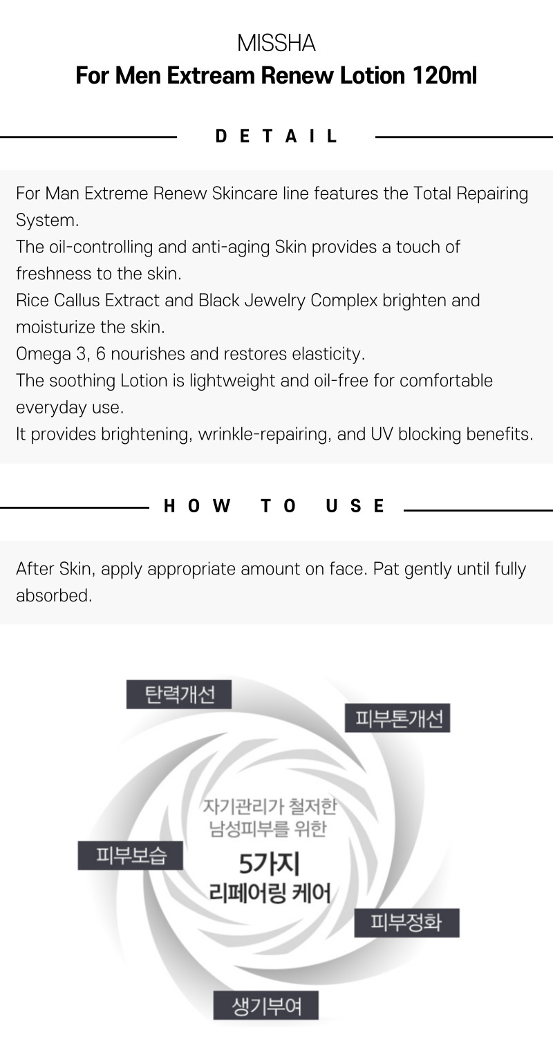 The MISSHA For Men Extreme Renew Lotion is an advanced skincare lotion specifically formulated for men. This lightweight lotion is designed to deeply hydrate and rejuvenate tired, stressed skin while enhancing elasticity and reducing the appearance of fine lines. Its fast-absorbing, non-greasy texture leaves your skin feeling smooth, refreshed, and ready to face daily challenges.